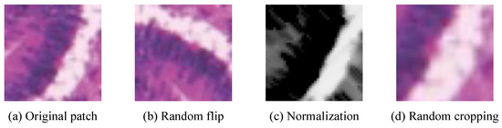 The workflow of our experiments contains three major components: data preprocessing, the CAM generation and refinement stage, and the segmentation stage. A data augmentation preprocessing procedure was utilized to increase data diversity and improve the generalization capability. The data augmentation techniques included the random horizontal and vertical flips (each with a probability of 0.5), a per-channel normalization using dataset-specific means and standard deviations, and a random cropping with crop ratios ranging from 0.7 to 1.0. Data augmentation visualizations of an example gland image are shown in Figure 6. All models were trained on a Linux server equipped with two NVIDIA GeForce RTX 3090 GPUs.