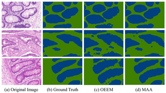 Visual comparison of segmentation results: (a) original image, (b) the ground truth, (c) the OEEM baseline, and (d) the proposed MAA method. The gland regions are displayed in blue color.