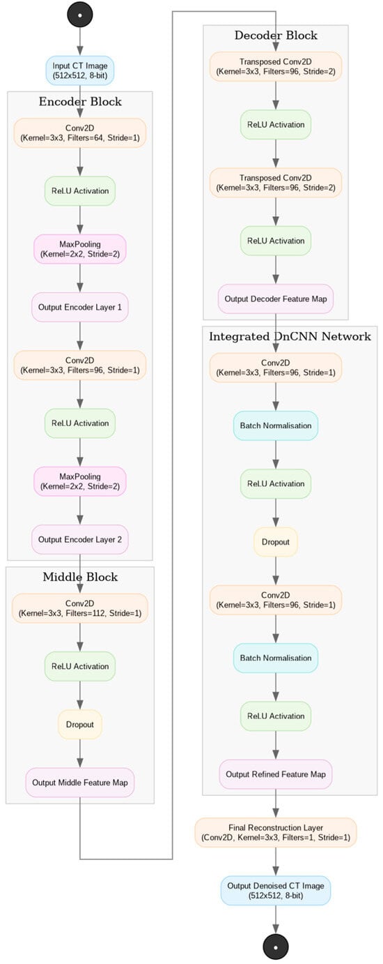 The ErisNet model (Figure 2) integrates the capabilities of the encoder–decoder architecture, inspired by U-Net [], with the efficacy of a denoising convolutional neural network (DnCNN) for noise removal []. This integration aims to mitigate noise in CT images while preserving critical diagnostic details.