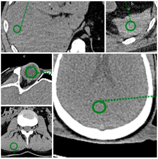 ROI placement at five anatomical locations for quantitative analysis. Circular green ROIs with radius 8 mm were positioned on: (a) liver parenchyma, (b) splenic parenchyma, (c) vitreous body of the eye, (d) brain parenchyma, and (e) lumbar paravertebral muscle. These anatomical regions were selected to evaluate ErisNet performance across different tissue types and attenuation characteristics.