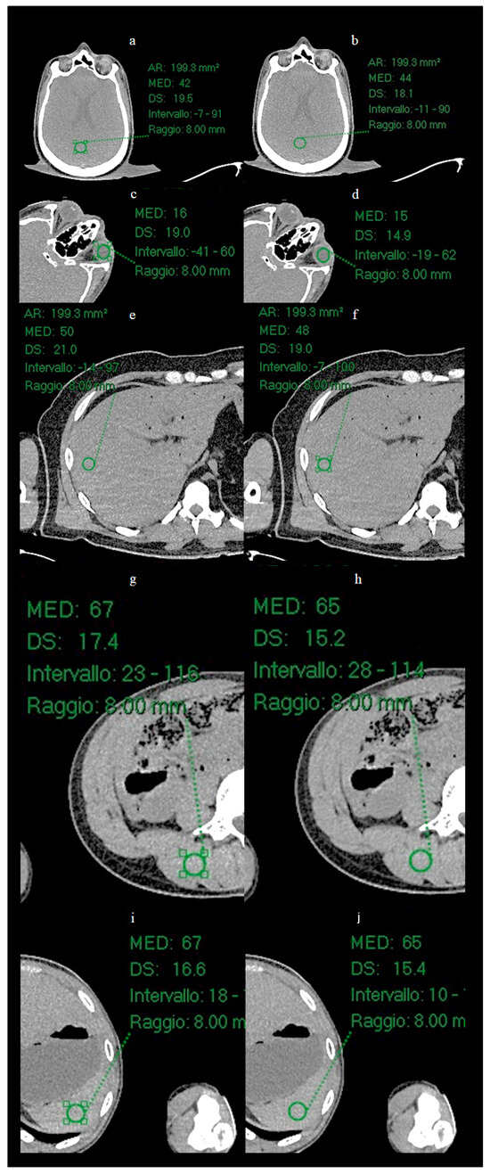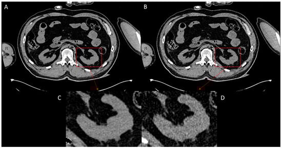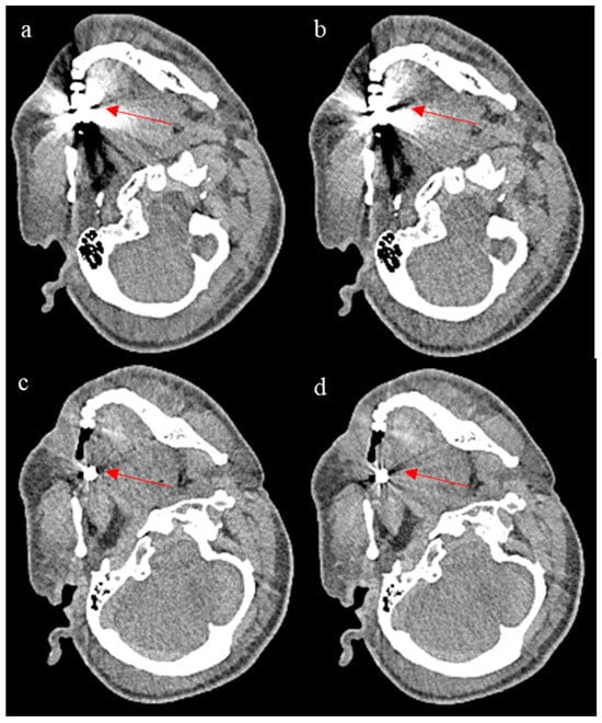 This issue is closely related to the amount of voltage and current, kV and mA, respectively, utilized during volume scanning; a lower use of these parameters results in a lower radiological dose delivered to the patient. The continuous development of noise reduction techniques [] is essential to maintain or improve the diagnostic quality of CT images [].