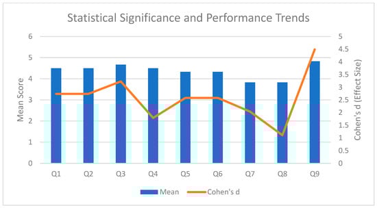 Statistical Significance and Performance Trends. Combined graph superimposing average scores and effect size. The blue bars show the average scores for each question, while the red line represents Cohen’s d values.