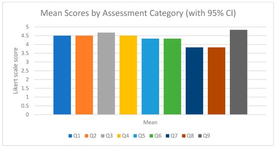 Average Scores by Assessment Category (with 95% CI). Histogram showing the average scores obtained for each question in the qualitative questionnaire, based on a Likert scale from 1 to 5. The error bars represent the 95% confidence interval (CI), indicating the precision of the mean estimate. The red dotted horizontal line at y = 3.0 represents the neutrality threshold.