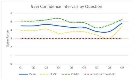 95% Confidence Intervals for Questions. Line graph showing the average score, upper confidence interval (CI Max), and lower confidence interval (CI Min) for each question. The green and yellow dotted lines represent the upper and lower limits of the confidence interval, respectively, while the red dotted line at y = 3.0 indicates the neutral threshold.