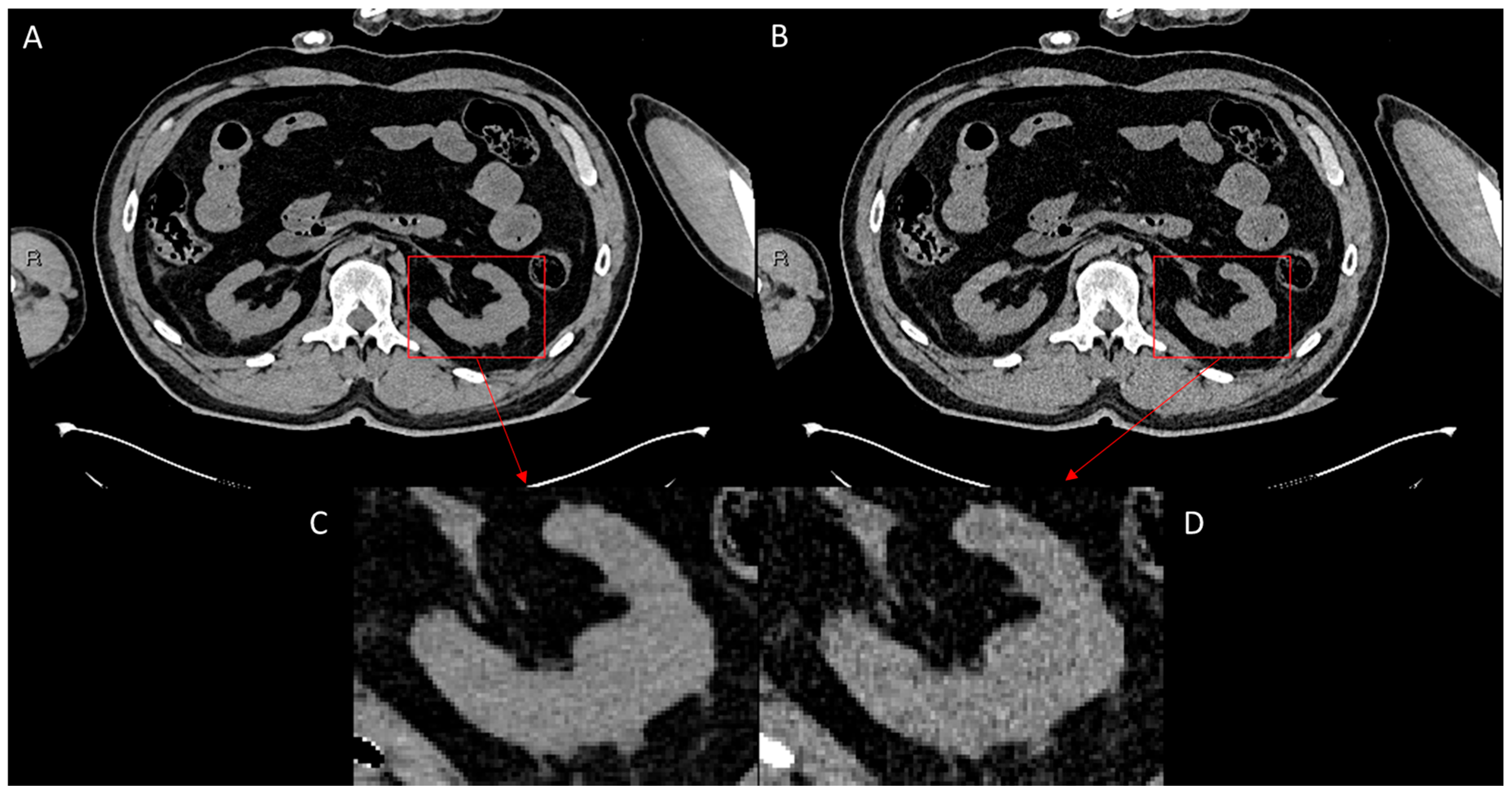 - Mileto, A.; Guimaraes, L.S.; McCollough, C.H.; Fletcher, J.G.; Yu, L. State of the art in abdominal CT: The limits of iterative reconstruction algorithms. Radiology 2019, 293, 491–503. [Google Scholar] [CrossRef] [PubMed]