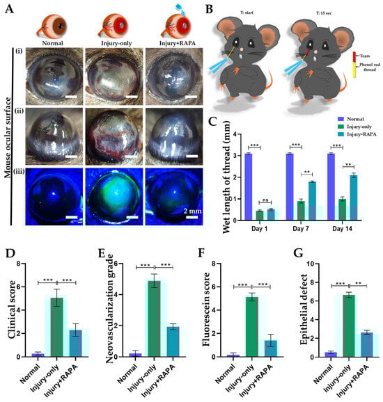 Effects of RAPA on the ocular surface in a mouse model of corneal alkali burn injury. (A): (i,ii) Slit lamp examination of corneas in the normal, injury-only, and injury + RAPA-treated groups. (iii) Fluorescein staining of corneas in the normal, injury-only, and injury + RAPA-treated groups. (B) Illustration of the phenol red thread test for evaluating tear secretion in mice, showing the thread positioned at the start time (t-start) and left on the eye for 15 s (t:15 s) before measuring tear absorption length in millimeters (mm). (C) Tear-secretion rate (measured in mm wetted within 15 s) in the normal, injury-only, and injury + RAPA-treated groups on days 1, 7, and 14. (D) Changes in corneal clinical scores in the normal, injury-only, and injury + RAPA-treated groups. (E) Changes in corneal neovascularization grade in the normal, injury-only, and injury + RAPA-treated groups. (F) Changes in corneal fluorescein staining scores in the normal, injury-only, and injury + RAPA-treated groups. (G) Changes in corneal epithelial defect in the normal, injury-only, and injury + RAPA-treated groups. In (C–G), data represent mean ± SEM (n = 9). One-way ANOVA followed by the Tukey test. * p < 0.05, ** p < 0.01, *** p < 0.001, ns, not significant.
