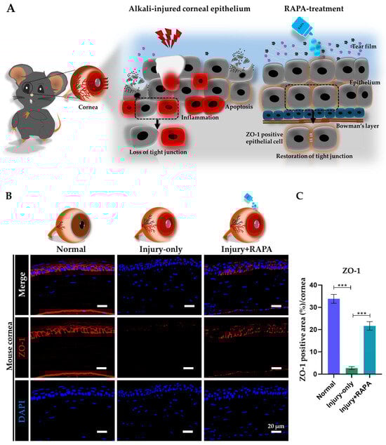Effects of RAPA on corneal epithelial barrier function in a mouse model of corneal alkali burn injury. (A) Schematic representation of the disintegration of ZO-1 tight junctions following corneal alkali burn injury. The injury compromises corneal epithelial barrier function, resulting in the loss of ZO-1 expression and disruption of epithelial integrity. RAPA treatment restores ZO-1 expression, indicating recovery of corneal epithelial function, maintenance of epithelial integrity, and reestablishment of tight barrier function. (B) Immunofluorescence staining for ZO-1 in the corneal epithelium of the normal, injury-only, and injury + RAPA-treated groups. (C) Changes in the expression of ZO-1. In (C), data represent mean ± SEM (n = 6). One-way ANOVA followed by the Tukey test. * p < 0.05, ** p < 0.01, *** p < 0.001.