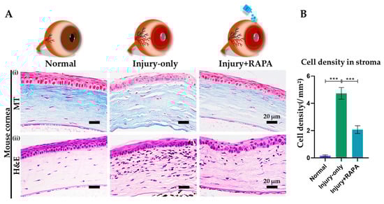 Effect of RAPA on the fibrotic alterations and inflammatory cell infiltration in the corneal stroma in the mouse model of corneal alkali burn injury. (A): (i) MT staining of mouse corneas to assess fibrotic tissue alteration in the normal, injury-only, and injury + RAPA-treated groups. (ii) H&E staining to evaluate inflammatory cell infiltration in the corneal stroma. (B) Changes in stromal inflammatory cell density among the groups. In (B), data represent mean ± SEM (n = 6). One-way ANOVA followed by the Tukey test. * p < 0.05, ** p < 0.01, *** p < 0.001.