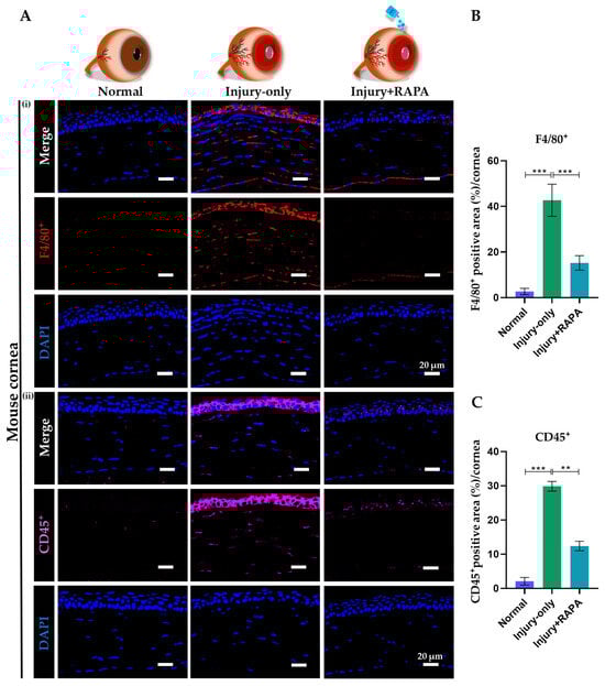Effects of RAPA on macrophage and pan-leukocyte infiltration in the cornea of a mouse model of corneal alkali burn injury. (A) Immunofluorescence staining for (i) F4/80+ and (ii) CD45+ in the corneas of the normal, injury-only, and injury + RAPA-treated groups. Changes in the expression of (B) F4/80+ and (C) CD45+. In (B,C), data represent mean ± SEM (n = 6). One-way ANOVA followed by the Tukey test. * p < 0.05, ** p < 0.01, *** p < 0.001.