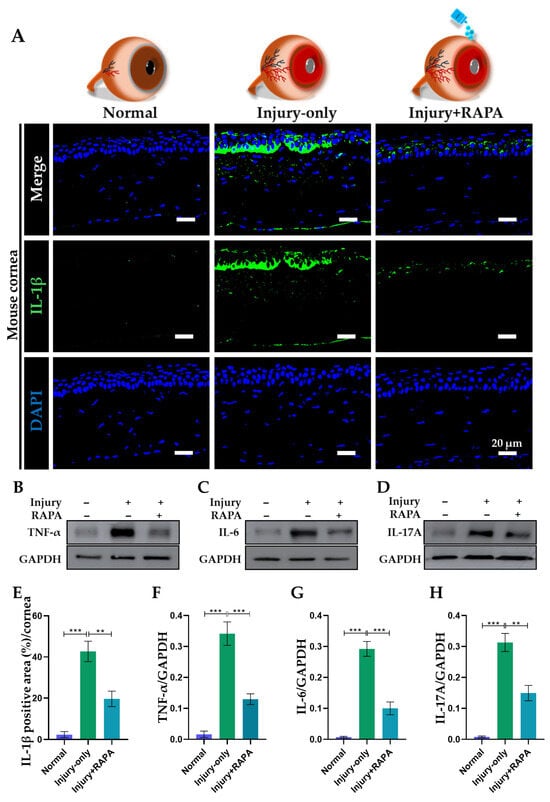 In the injury group, we observed robust immunoreactivity for IL-1β and a marked increase in the protein expression levels of TNF-α, IL-6, and IL-17A, confirming a strong inflammatory response that parallels earlier research in corneal alkali burn injury [,]. In contrast, corneas from RAPA-treated mice showed considerably reduced expression of IL-1β (Figure 6A,E) and lower protein levels of TNF-α, IL-6, and IL-17A, as demonstrated by western blot analysis (Figure 6B–D,F–H).
