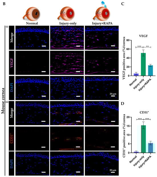 Effects of RAPA on angiogenic mediators and endothelial markers in the cornea of a mouse model of corneal alkali burn injury. (A) Schematic representation of increased VEGF expression in the cornea following alkali burn injury, which promotes pathological neovascularization. RAPA treatment downregulated VEGF expression, resulting in reduced neovascularization in the cornea. (B) Immunofluorescence staining for (i)VEGF and (ii) CD31+ in the corneas of the normal, injury-only, and injury + RAPA-treated groups. Changes in the expression of (C) VEGF and (D) CD31+. In (C,D), data represent mean ± SEM (n = 6). One-way ANOVA followed by the Tukey test. * p < 0.05, ** p < 0.01, *** p < 0.001.