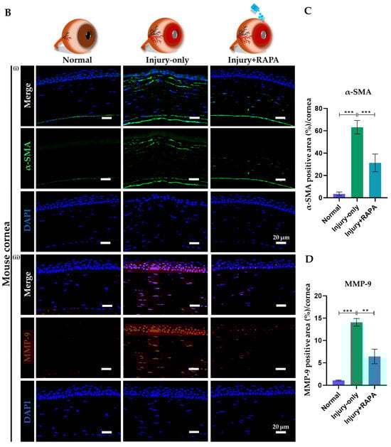 Effects of RAPA on α-SMA–positive myofibroblast-associated fibrosis and MMP-9-mediated pathological matrix remodeling. (A) Schematic representation of fibrotic tissue remodeling leading to corneal scarring following alkali burn injury. The injury induces the transformation of resident corneal fibroblasts into contractile myofibroblasts expressing α-SMA, resulting in excessive ECM deposition and stromal disorganization, which contributes to corneal haze and visual impairment. In contrast, RAPA treatment inhibits α-SMA expression, suppresses myofibroblast differentiation, and induces myofibroblast apoptosis, thereby reducing fibrosis and preserving corneal transparency. (B) Immunofluorescence staining for (i) α-SMA and (ii) MMP-9 in the corneas of the normal, injury-only, and injury + RAPA-treated groups. Changes in the expression of (C) α-SMA and (D) MMP-9. In (C,D), data represent mean ± SEM (n = 6). One-way ANOVA followed by the Tukey test. * p < 0.05, ** p < 0.01, *** p < 0.001.