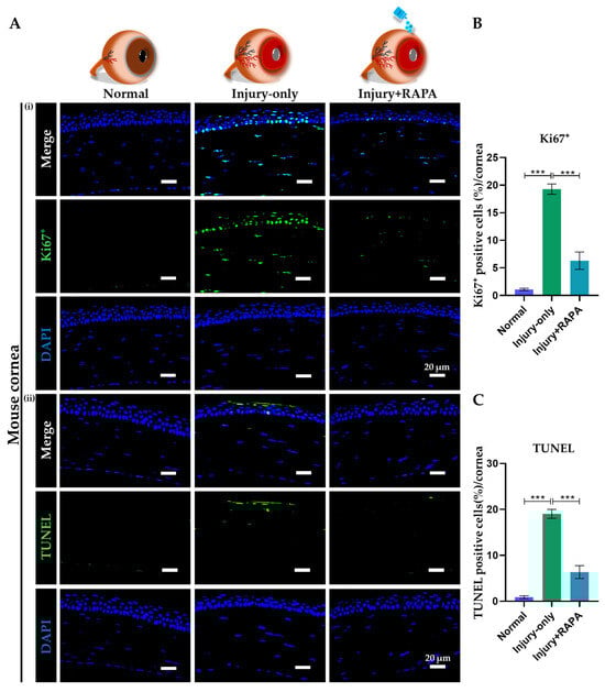 Effects of RAPA on dysregulated cell proliferation and cellular apoptosis in the cornea of a mouse model of corneal alkali burn injury. (A) Immunofluorescence staining for (i) Ki67+ and (ii) TUNEL in the corneas of the normal, injury-only, and injury + RAPA-treated groups. Changes in the expression of (B) Ki67+ and (C) TUNEL-positive cells. In (B,C), data represent mean ± SEM (n = 6). One-way ANOVA followed by the Tukey test. * p < 0.05, ** p < 0.01, *** p < 0.001.