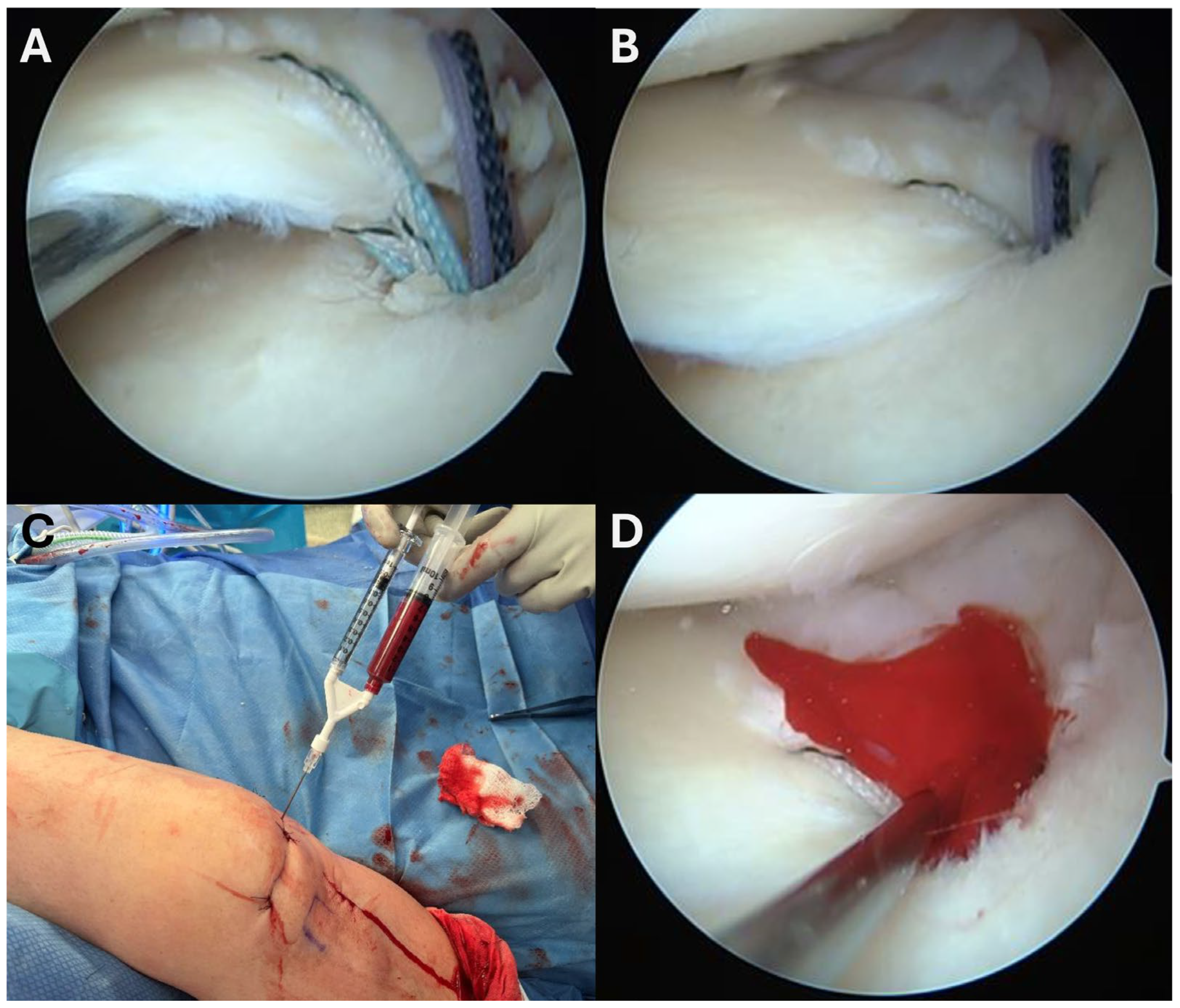 39. Dancy, M.E.; Marigi, E.M.; Krych, A.J.; Werner, B.C.; Camp, C.L. Impact of Biologic Augmentation on Revision Surgery Rates After Meniscus Repair: A Matched-Cohort Analysis of 3420 Patients. Orthop. J. Sports Med. 2023, 11, 23259671231186990. [Google Scholar] [CrossRef]