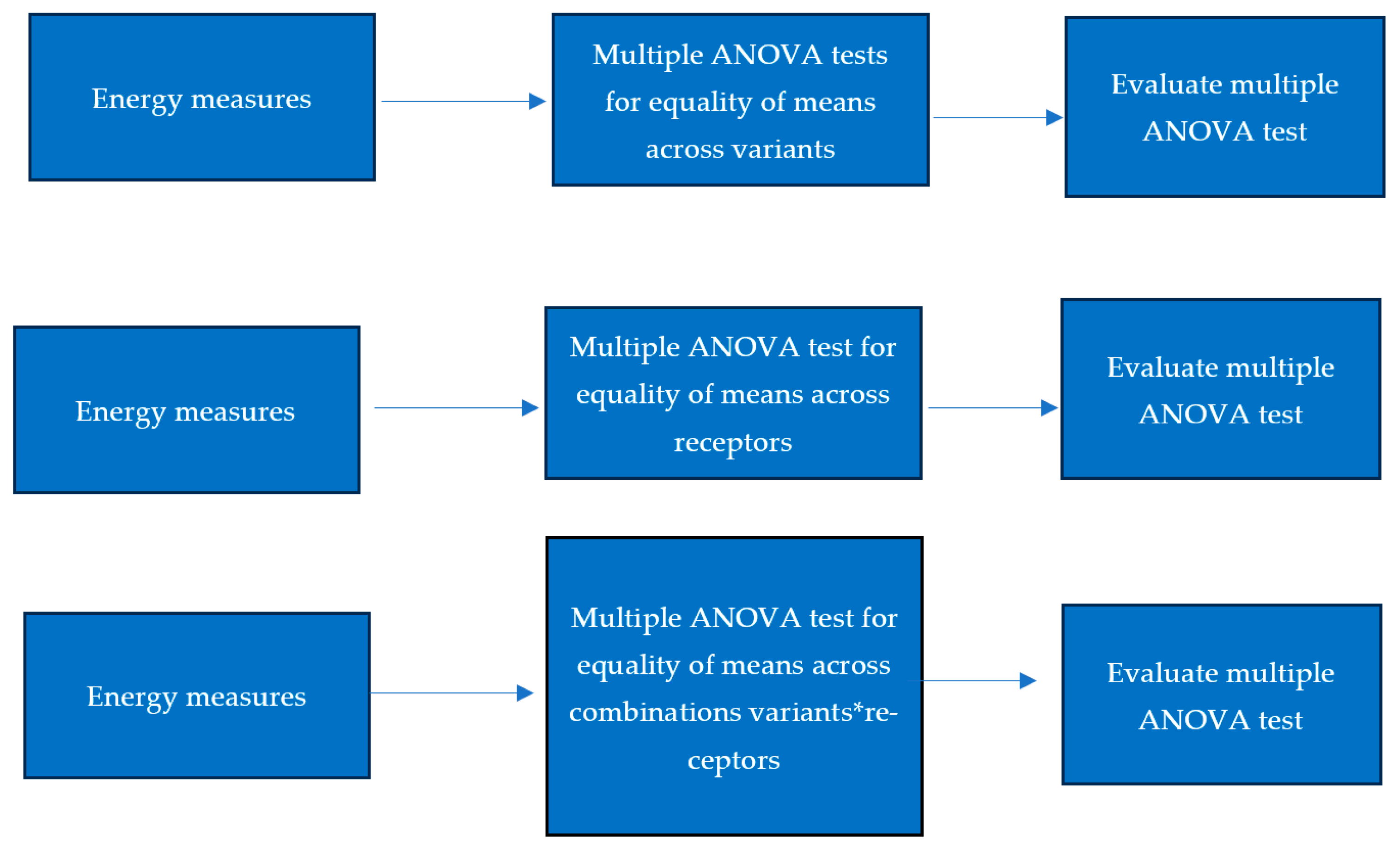 −1). Finally, when multiple Bartlett tests are applied to combinations, it is found that the variances in energy differ significantly across the combinations of variants and receptors (