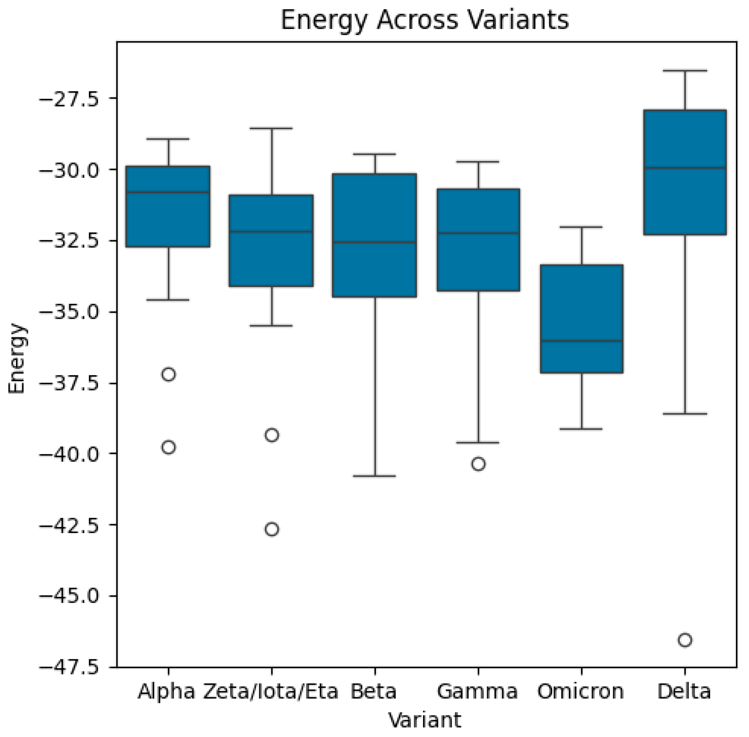 40]. Indeed, incorporating these energy metrics can potentially enhance differentiation and provide a more stable and biologically meaningful basis for assessing variant behavior. In addition, we found that there are significant differences in energy interaction between various viral strains. According to Nguyen et al. [
