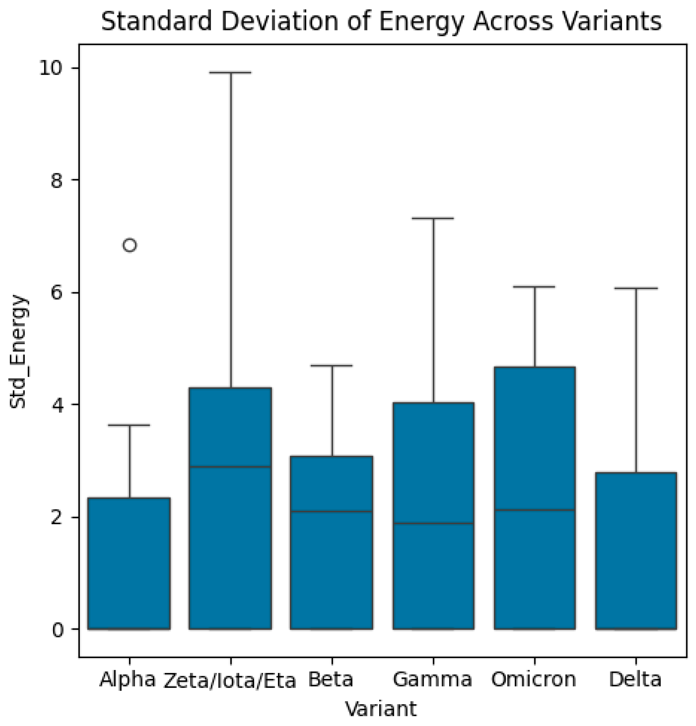 Moreover, the Bartlett test showed no significant differences in the variances in mean energy or standard deviation of energy across the groups, further emphasizing that these measures do not exhibit substantial variation across variants, receptors, or combinations. The absence of significant variance differences in mean energy and standard deviation suggests that while energy is a clear differentiator, the variability within these measures is minimal, reinforcing the robustness of energy as a key factor in distinguishing viral-receptor interactions.