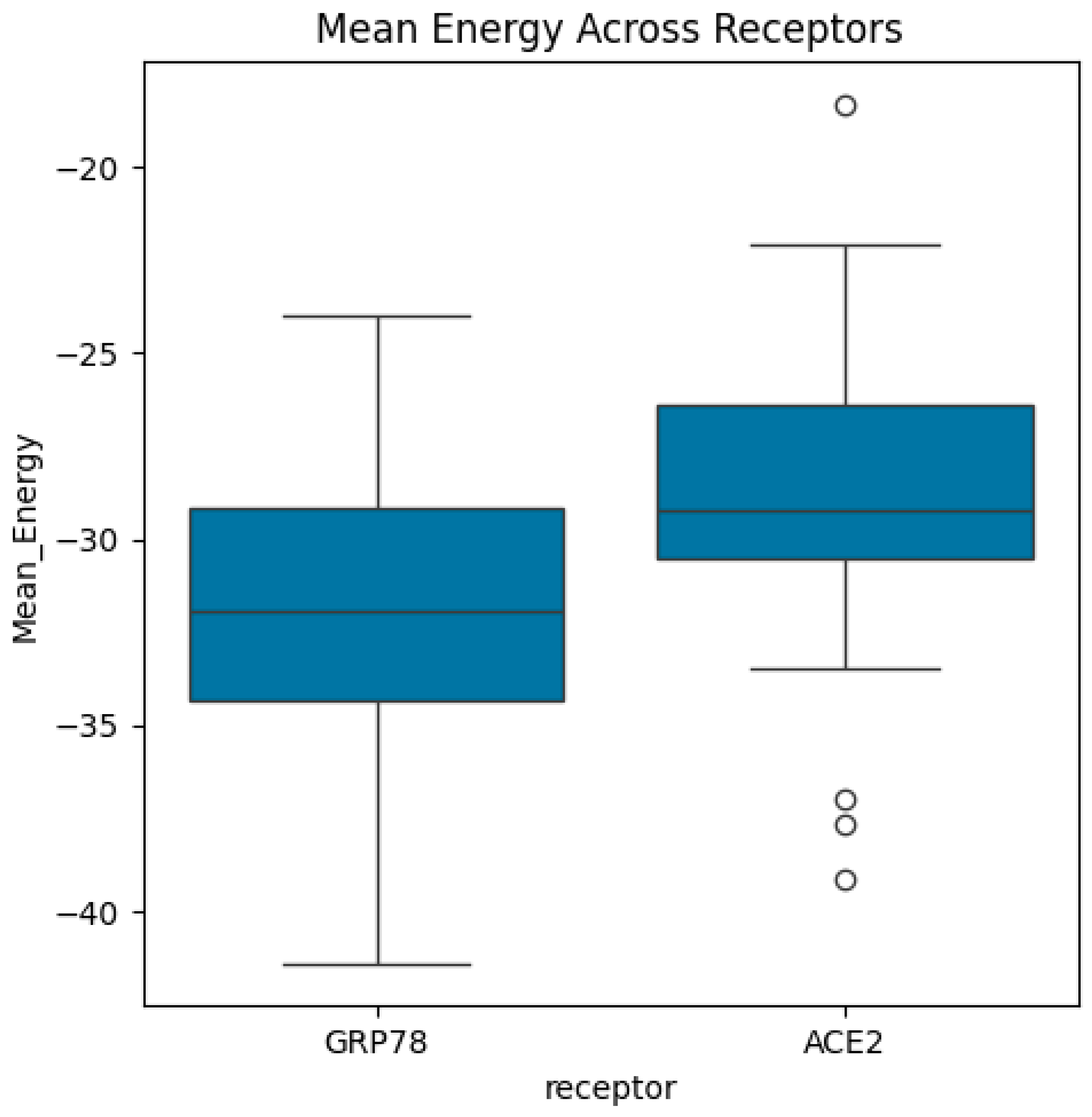 41], this discovery advances our understanding of how structural modifications to the viral spike protein affect binding energetics and, consequently, infectivity. Furthermore, we found that mean energy distinguishes between the ACE2 and GRP78 receptors, which offers a thermodynamic explanation for differences in receptor vulnerability. Previous studies have focused on the structural compatibility of the receptors [