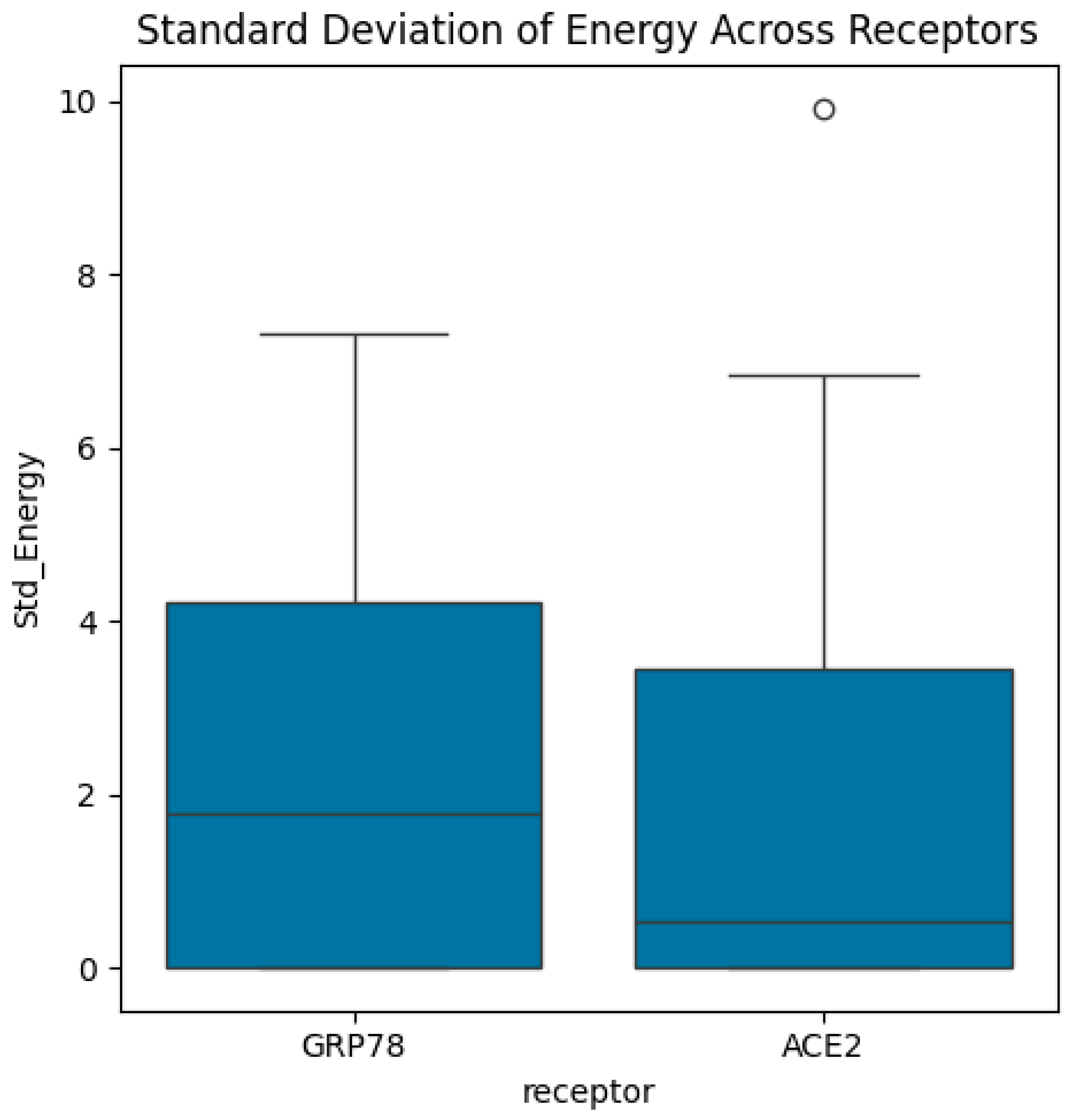 The standard deviation of energy, however, did not show significant differences across variants or combinations in the ANOVA analysis. This suggests that the variability in energy interactions is relatively consistent across these groups, implying that standard deviation is not a useful measure for distinguishing between them. Interestingly, the Bartlett test showed significant differences in the variances in energy across variants and combinations but not across receptors. This finding indicates that while the energy values themselves differ significantly, the variance in these values is more pronounced when comparing different variants and their combinations with receptors. The lack of significant variance differences across receptors suggests that the receptor’s role in the interaction does not vary as much as the variants themselves, potentially reflecting the more consistent binding properties of ACE2 and GRP78 compared to the dynamic nature of SARS-CoV-2 variants.
