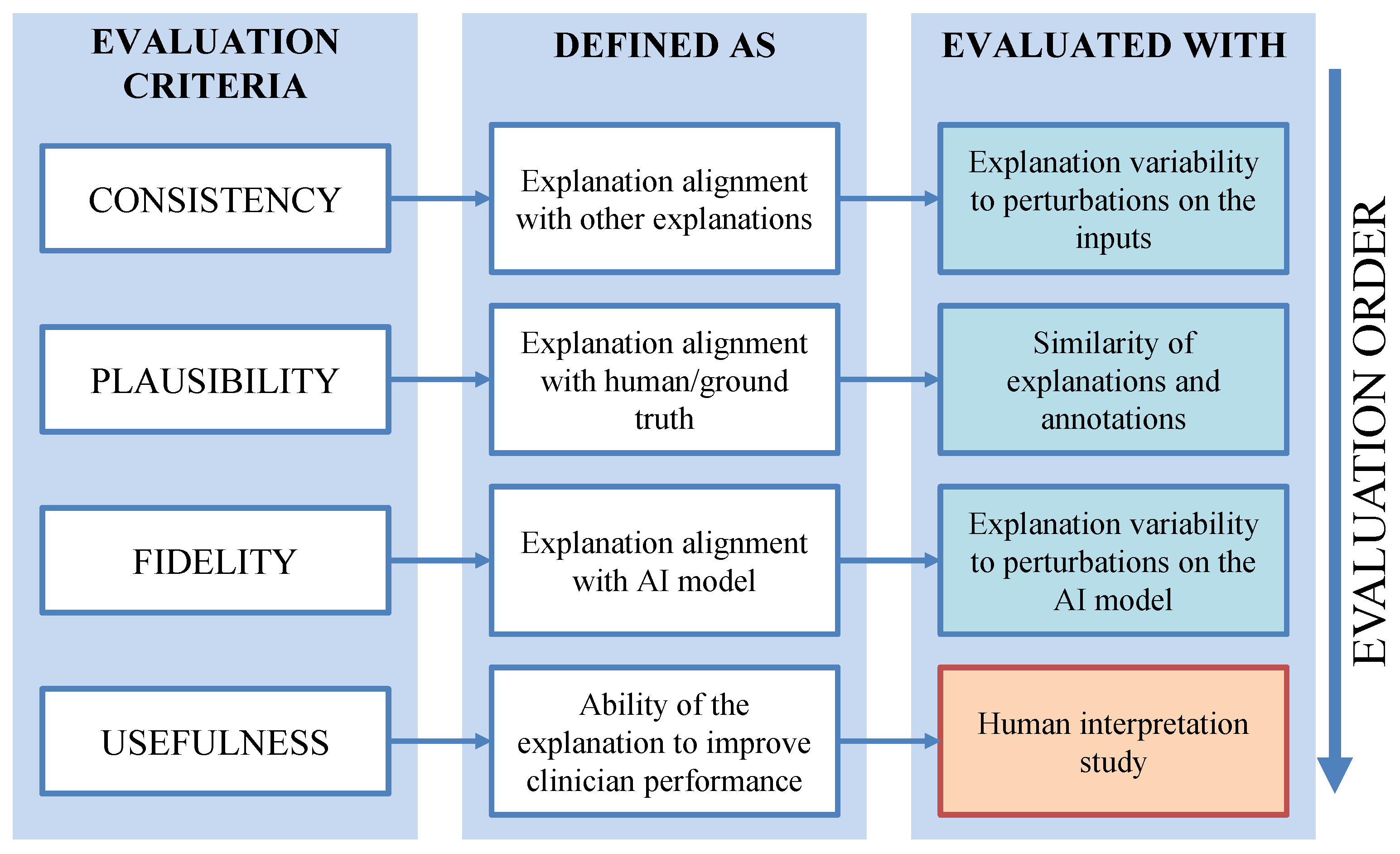 Three of our proposed criteria–Consistency, Plausibility, and Fidelity–can be evaluated on previously-collected data, while Usefulness require a human task-based performance assessment. To best use resources, we have structured the evaluation framework in a specific order, proposing the evaluation of Consistency, Plausibility, and Fidelity in that order, followed by Usefulness. This ordering helps to minimize resources, as explanations with low Consistency can be evaluated before moving to Plausibility and Fidelity, which can then proceed to human task-based evaluation studies for Usefulness.