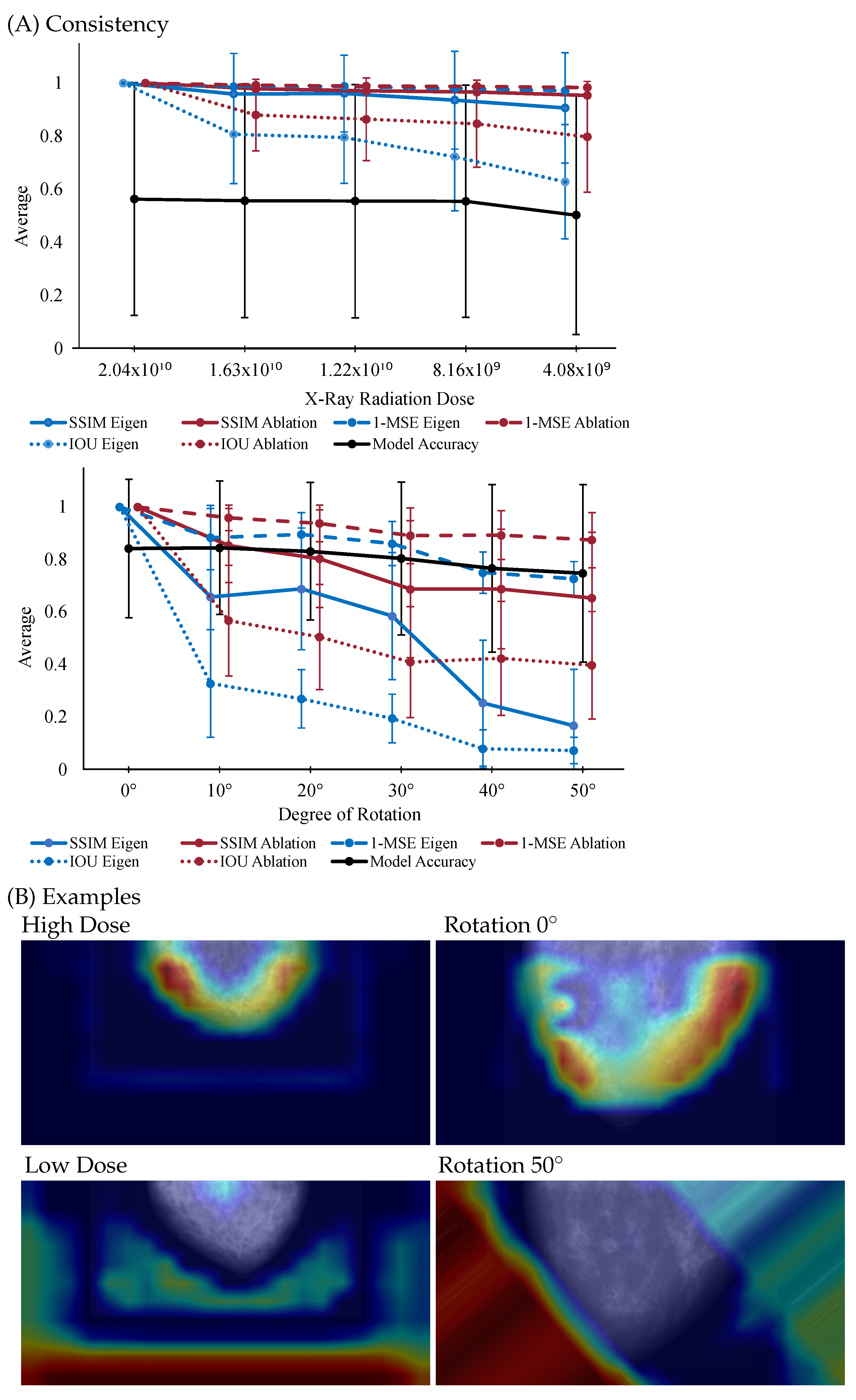 Figure 2A, consistency is quantified using SSIM, MSE, and IoU, with the corresponding values compared across different radiation doses and rotation angles. Despite the model’s accuracy remaining stable, SSIM, MSE, and IoU values exhibit notable fluctuations, which highlights how explainability methods can behave inconsistently under subtle changes.