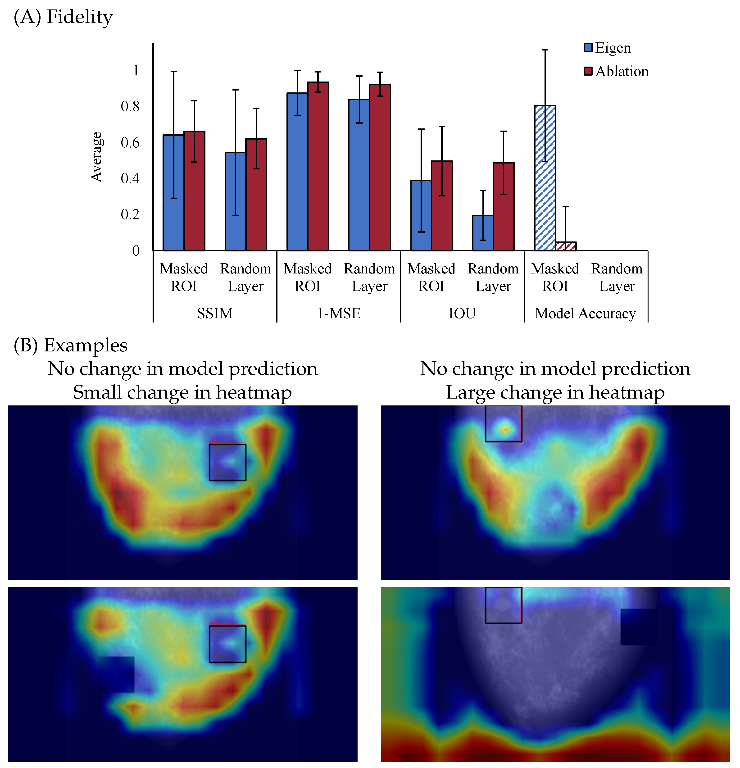 Figure 4A, Ablation CAM consistently exhibits higher fidelity than Eigen CAM, indicating that it more faithfully reflects the model’s internal reasoning when the model’s parameters are perturbed. Particularly, with each metric, Ablation CAM has reduced similarity to the un-perturbed explanation, but correspondingly reduces the accuracy of the model. Together, this suggests that Ablation CAM is producing higher fidelity explanations due to disruption in similarity and model performance. In contrast, Eigen CAM shows lower fidelity, with increased variability between the different metrics and a spared model accuracy after perturbation for the masked ROI case, which highlights its weaker connection to the model’s internal mechanisms. Together, these results suggest that comparison between explanations before and after perturbation is necessary to examine fidelity but that examining accuracy is also critical for a full account of fidelity. Though fidelity and model accuracy are independent, understanding how the explanation aligns with the model’s decision is critical to fully understanding fidelity. The pattern of results presented in