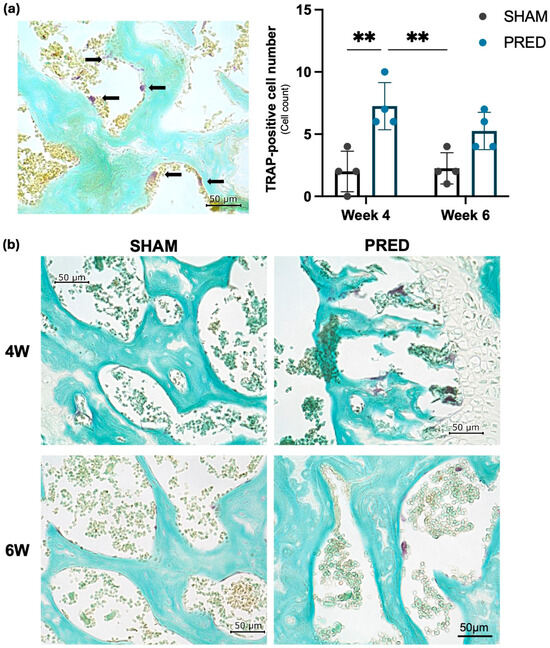 (a) Osteoclastogenesis was evaluated with tartrate-resistant acid phosphatase (TRAP)-positive cells indicated by black arrows. For quantification of TRAP-positive cells, six randomly selected fields of view were used from the high magnification (0.1 mm2) of the microscope. (b) Representative image of TRAP staining. TRAP-positive cells were significantly higher in the PRED group than in the SHAM group at 4 weeks postoperatively (** p > 0.01, n = 4 in each group).