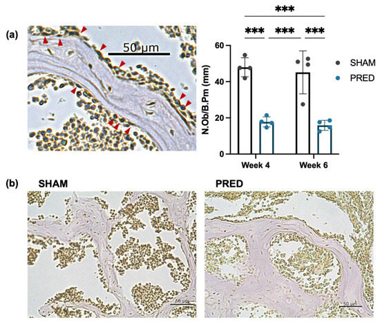 (a,b) Representative image of alkaline phosphatase (ALP) staining. The number of ALP-positive osteoblasts (red arrows) per trabecular bone was counted at high magnification of the microscope. The number of ALP-positive osteoblasts per trabecular perimeter was significantly higher in the SHAM group than in the PRED group at both weeks 4 and 6 (*** p < 0.001, n = 4 in each group).