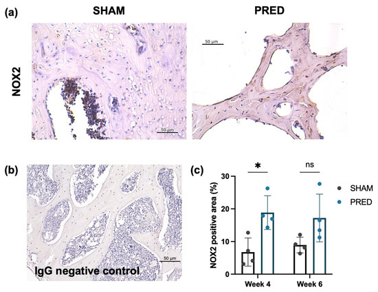(a) Representative IHC images of Nox2 at the femoral head trabecular bones of the SHAM and PRED groups. (b) IgG-stained negative control images. (c) Significant difference detected at week 4 between the SHAM and PRED group. * p < 0.05, ns represents no significant difference.
