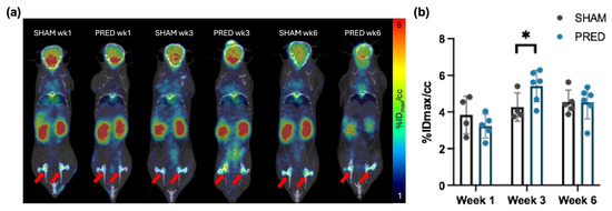 (a) Representative image of 18F-fluorodeoxyglucose PET/CT. The activity uptake within the ROI is expressed as the percentage of injected dose per cubic centimeter within the voxel containing the highest activity (%IDmax/cc). Red arrows indicate bilateral femoral heads. (b) Uptake in the femoral head was higher in the PRED group than in the SHAM group at 3 weeks after treatment (* p = 0.04, n = 4–6 in each group).