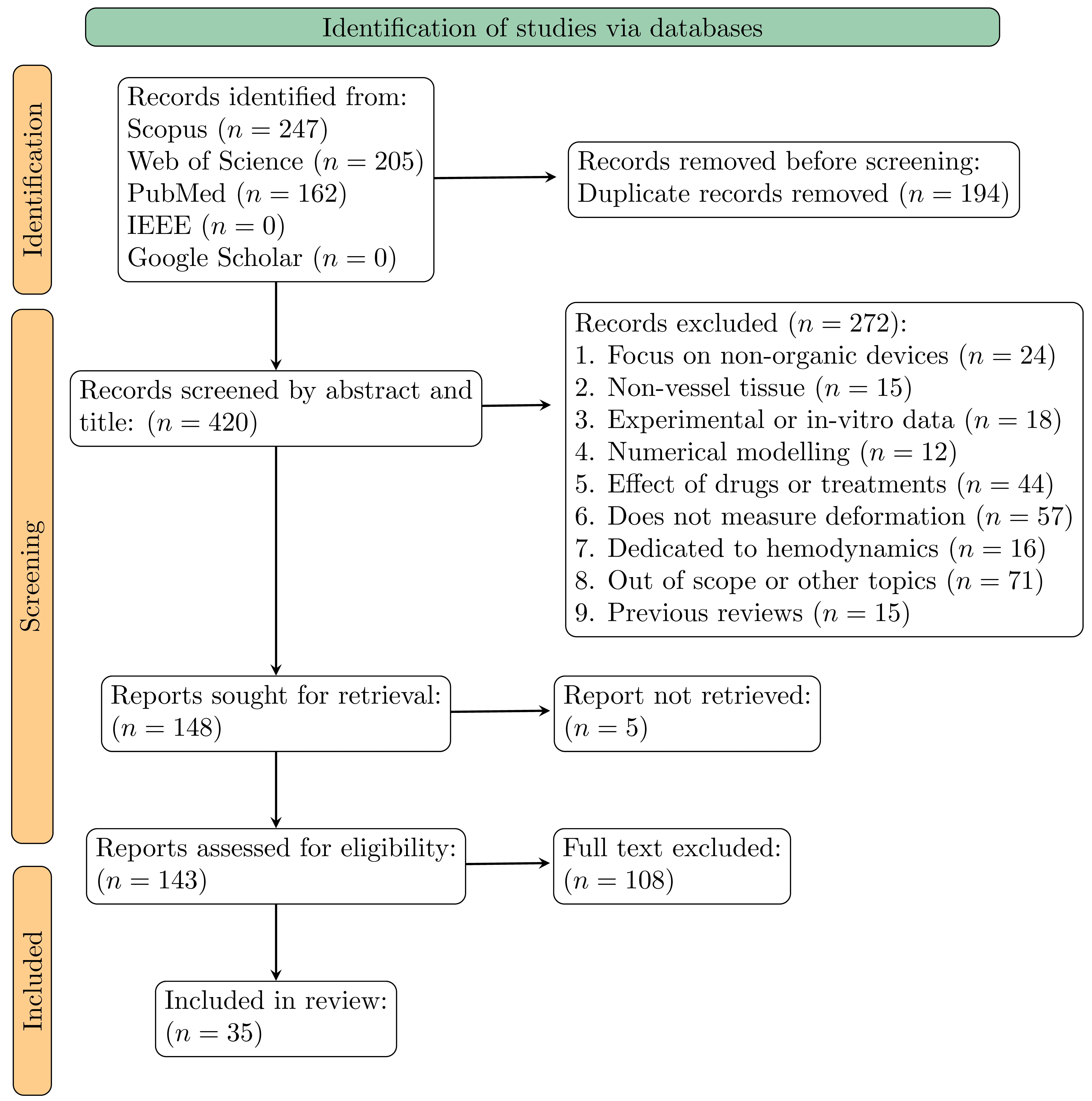 (“aorta” OR “aortic” OR “arterial” OR “vascular”) AND (“patient-specific” OR “in vivo”) AND (“strain” OR “deformation” OR “compliance” OR “motion tracking”) AND (“Computed Tomography” OR “CT” OR “Magnetic Resonance” OR “MRI”) AND NOT (“experimental” OR “Fluid-structure interaction” OR “computational fluid” OR “Finite element” OR “heart”).
