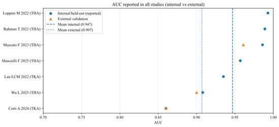 To further analyse the robustness and generalizability of the included AI models, the reported performance metrics across studies were aggregated, stratifying by validation type (internal vs. external) and joint type (THA vs. TKA). Figure 2, Figure 3, Figure 4, Figure 5, Figure 6 and Figure 7 illustrate the distribution of accuracy and AUC for these subgroups. Consistent with the narrative synthesis, internal validation metrics generally exhibited higher and less variable values compared to external validation results. Furthermore, models developed for THA demonstrated slightly higher median performance metrics compared to those for TKA.