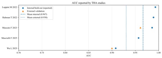 Area under the curve of AI models for studies that analysed total hip arthroplasty (THA), reported in internal and external validation datasets [11,17,18,19,20].