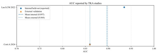 Area under the curve of AI models for studies that analysed total knee arthroplasty (TKA), reported in internal and external validation datasets [13,16].