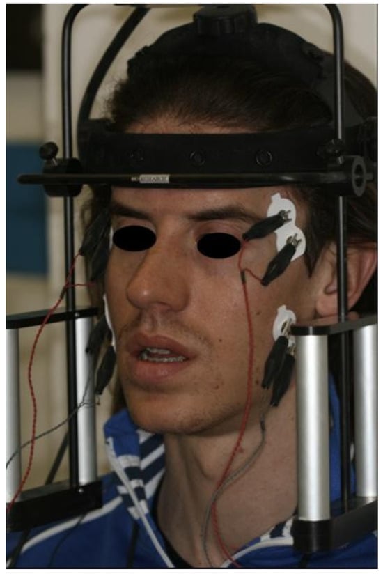 - Temporal muscle: The muscle mass was palpated while the patient clenched the teeth to identify the major axis of the zygomatic process of the frontal bone. The bipolar electrode was then positioned along a line parallel to this axis. In this manner, the electrode was aligned parallel to the muscle fibers and placed at a relatively superficial level with respect to the frontoparietal suture.