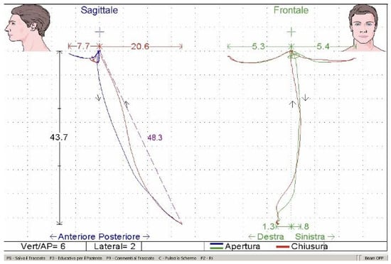 Electrokinesiographic recording of mandibular movements. Sagittal and frontal tracings illustrate maximum mouth opening, protrusion, and lateral excursions during functional tasks, allowing quantitative assessment of mandibular kinematics throughout treatment phases.