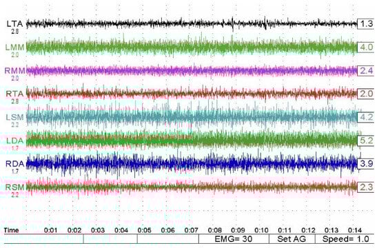 The two different electromyographic systems were used in a complementary and standardized manner, according to their technical specifications (Figure 3). The Freely electromyograph (De Gotzen, Legnano, Italy) was used to assess standardized electromyographic indices, including Percent Overlapping Coefficient (POC) and IMPACT values, which are based on normalized signal processing and are not dependent on raw signal amplitude (Figure 4). The K6-I system (Myotronics, Tukwila, WA, USA) was used to record electromyographic activity expressed in microvolts (µV) and to perform electrokinesiographic (EKG) analysis of mandibular movements, which cannot be evaluated using the Freely system.