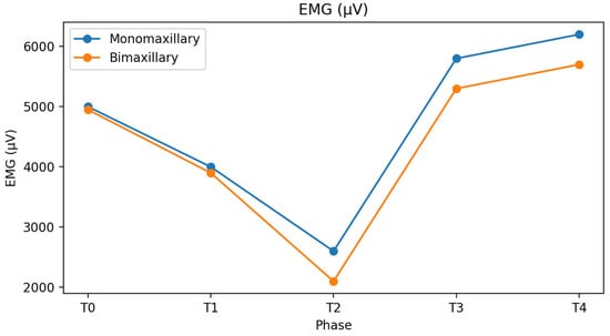 Electromyographic activity expressed in microvolts followed a comparable pattern. All patients showed signs of neuromuscular decompensation after the initiation of orthodontic treatment, without significant differences between surgical approaches. During the subsequent phases, monomaxillary patients demonstrated a more homogeneous recovery, whereas bimaxillary patients exhibited wider inter-individual variability. This variability has been extensively documented in the literature and reinforces the concept that neuromuscular adaptation after orthognathic surgery is highly patient-specific and modulated by multiple factors, including muscle morphology, skeletal pattern, and adaptive capacity [5,28,29].