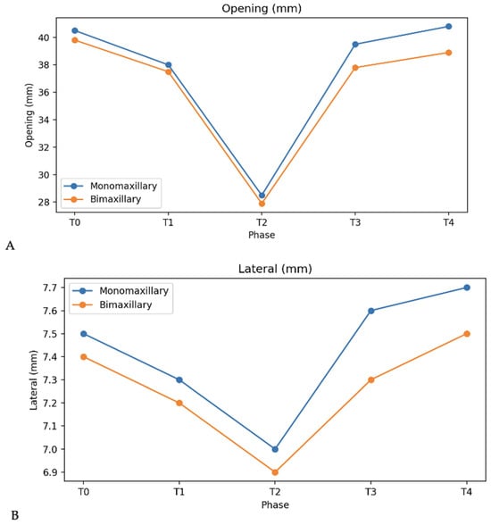 Mandibular kinesiographic parameters (mm) recorded in monomaxillary and bimaxillary patients during the observation period: (A) maximum mouth opening; (B) lateral excursions.