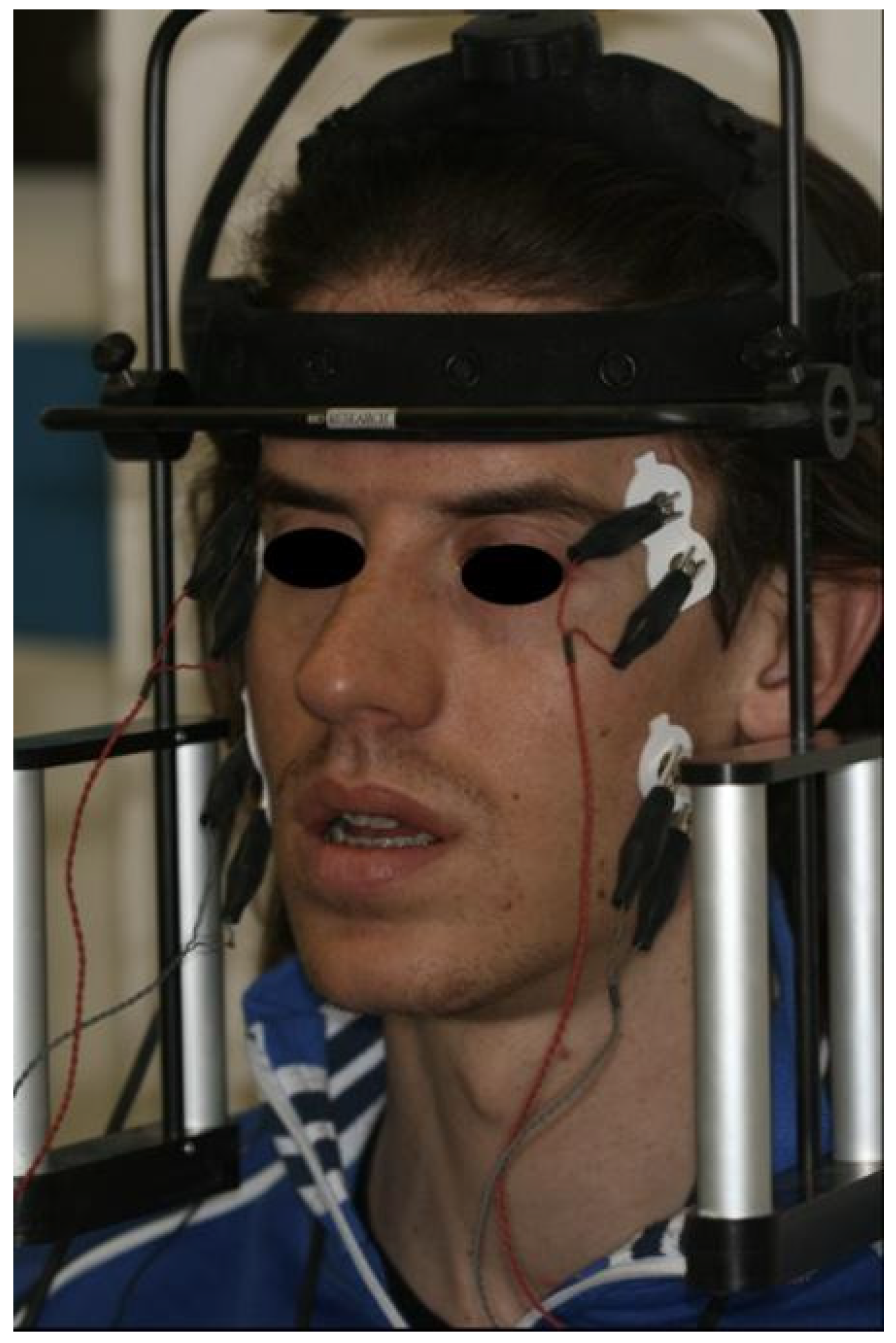 Temporal muscle: The muscle mass was palpated while the patient clenched the teeth to identify the major axis of the zygomatic process of the frontal bone. The bipolar electrode was then positioned along a line parallel to this axis. In this manner, the electrode was aligned parallel to the muscle fibers and placed at a relatively superficial level with respect to the frontoparietal suture.