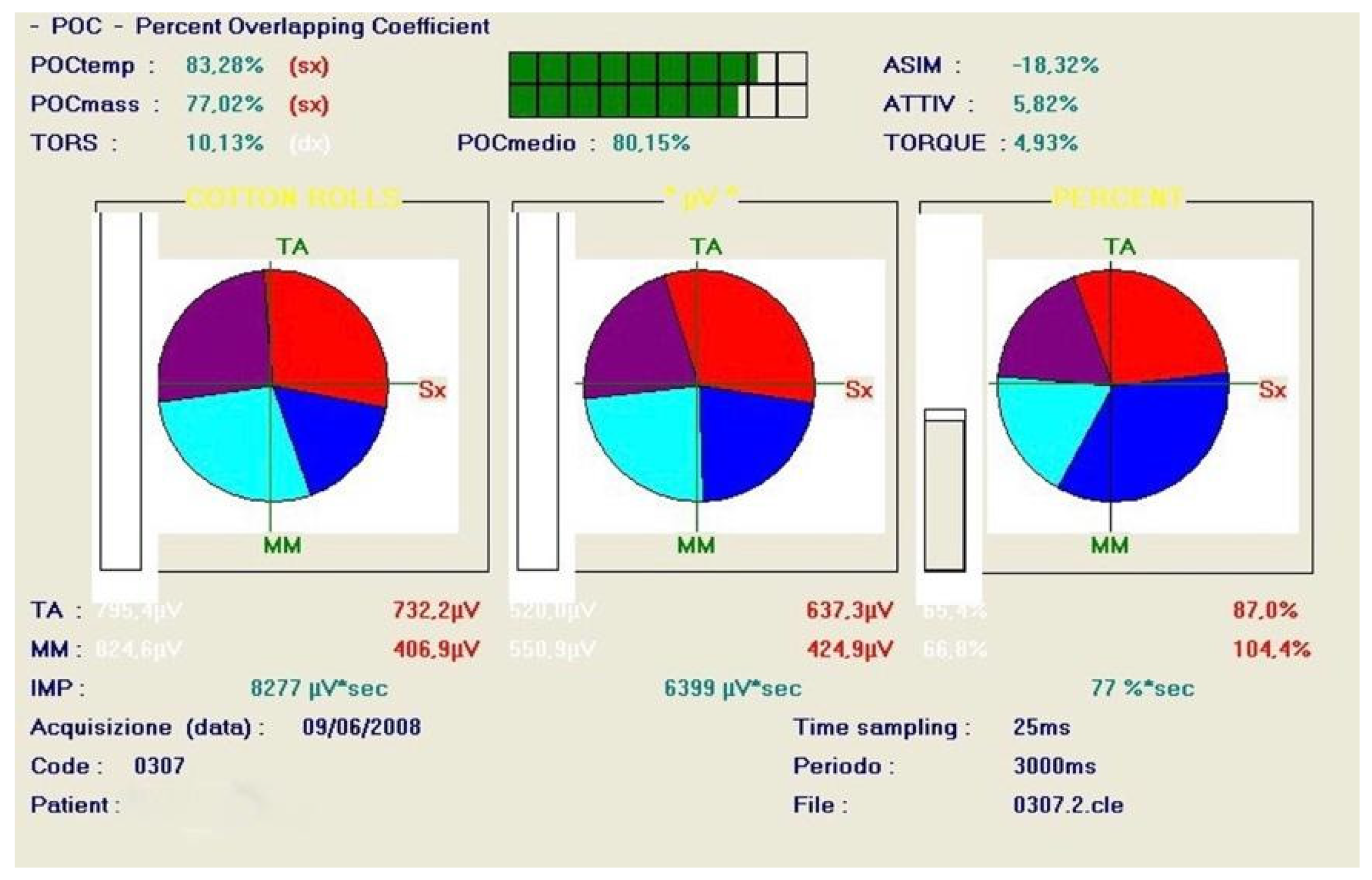 The analyzed parameters included electromyographic symmetry indices (POC, percent overlapping coefficient) of the masseter and anterior temporalis muscles, muscle activity expressed in microvolts, and IMPACT values recorded during clenching on cotton rolls and in habitual position. Electrokinesiographic parameters included maximum mouth opening, protrusion, lateral excursions, and mandibular rest position.