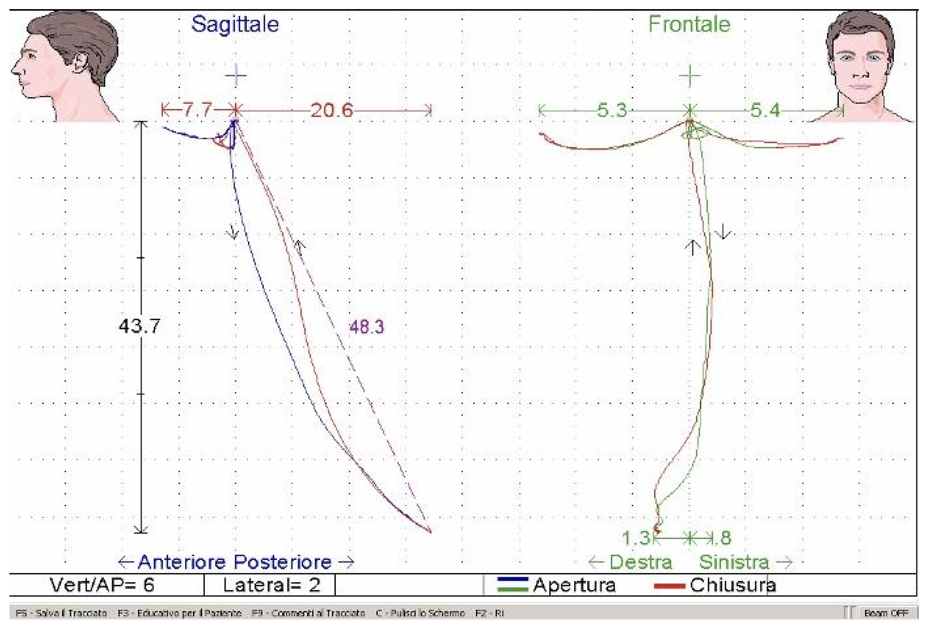 In addition to sEMG, kinesiographic analysis of mandibular movements is an essential tool for an integrated functional evaluation. The integration of EMG and mandibular kinesiography allows for the correlation of masseter and anterior temporalis activity with kinematics—including mouth opening, protrusion, and lateral movements [