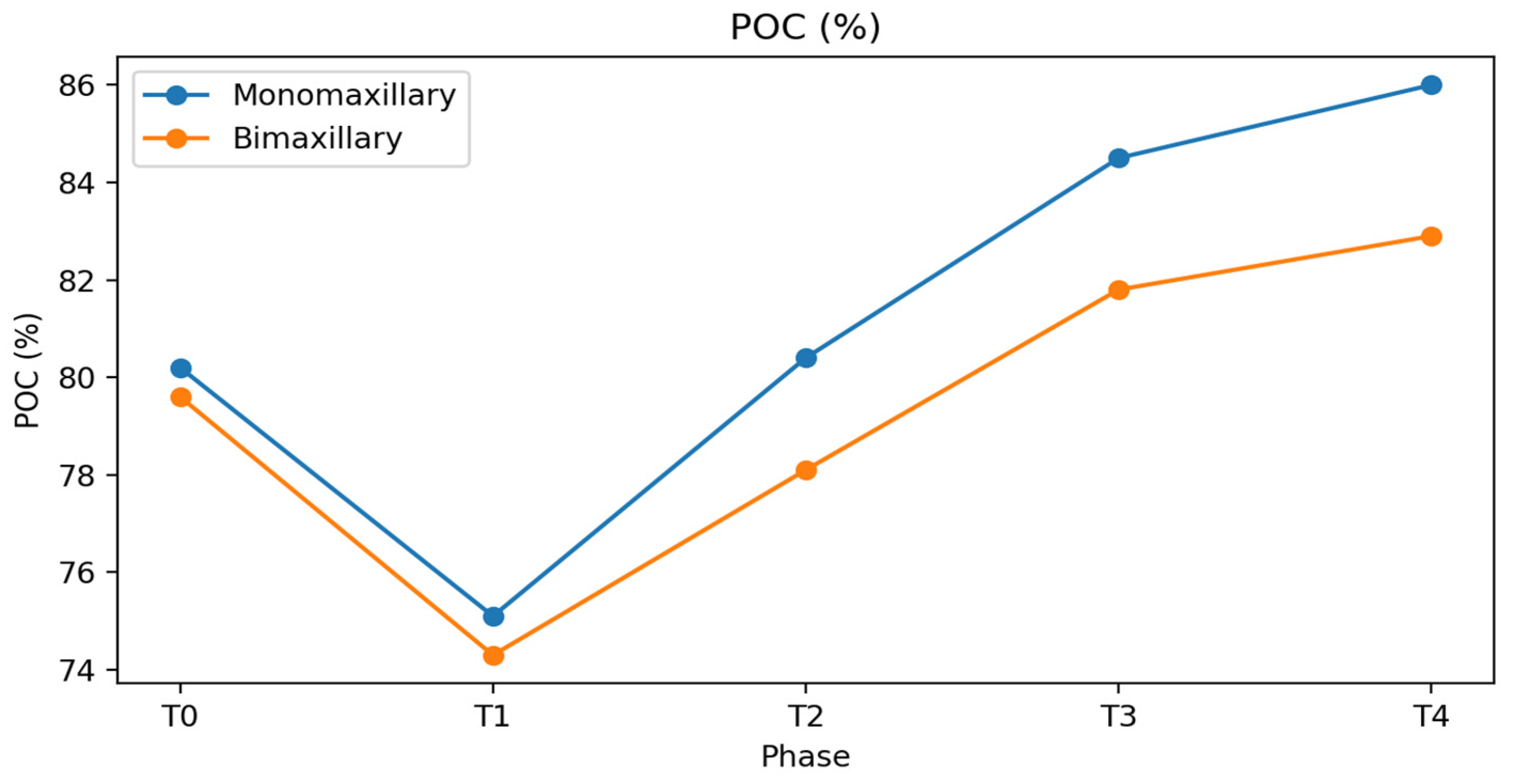 Figure 6). POC values observed at follow-up were comparable to those of the control group (85 ± 1.2). The group treated with the monomaxillary approach reached and exceeded this reference value, whereas the bimaxillary group approached it closely without fully attaining it, numerically lower than references values.