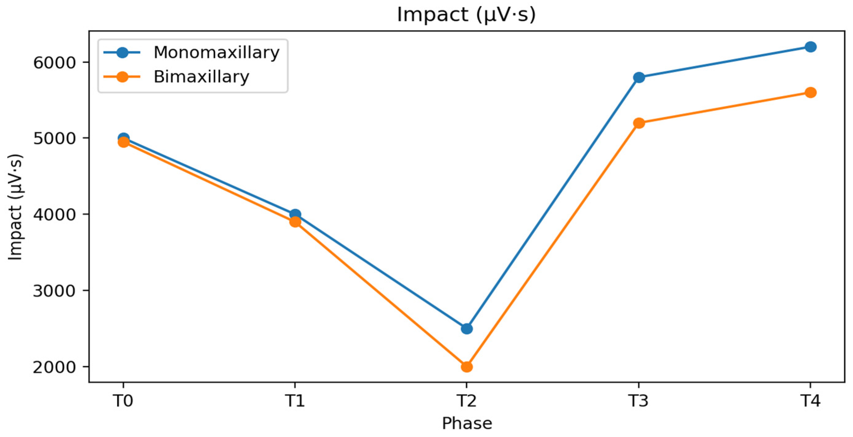 At baseline, Impact values were approximately 5000 ± 800 µV·s in both groups and decreased to about 4000 ± 700 µV·s in the preoperative phase. In the immediate postsurgical phase, a marked reduction was observed, more pronounced in bimaxillary patients (2000 ± 500 µV·s) than in monomaxillary patients (2500 ± 600 µV·s). During the postsurgical orthodontic phase, Impact values increased more rapidly in monomaxillary patients—particularly in those treated with maxillary surgery alone—reaching values closer to physiological ranges at the end of treatment.