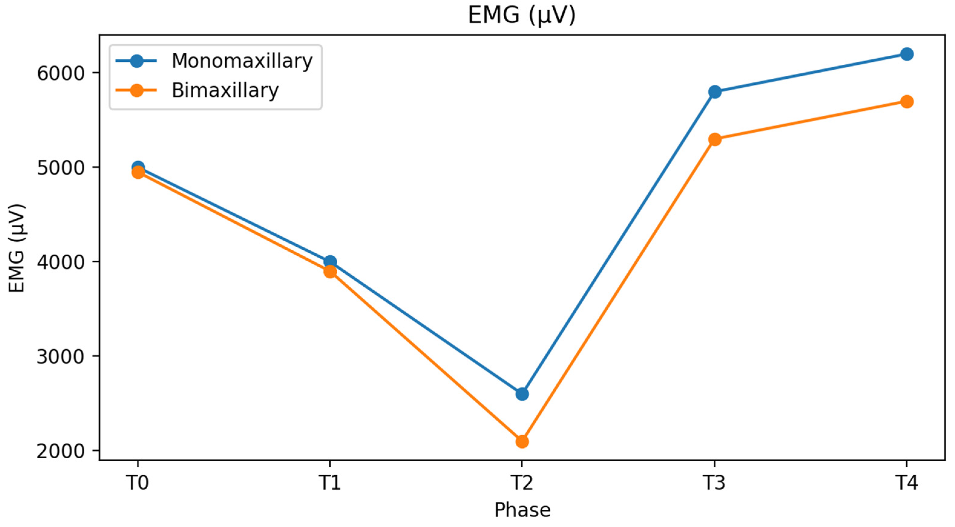 Electromyographic activity expressed in microvolts followed a comparable pattern. All patients showed signs of neuromuscular decompensation after the initiation of orthodontic treatment, without significant differences between surgical approaches. During the subsequent phases, monomaxillary patients demonstrated a more homogeneous recovery, whereas bimaxillary patients exhibited wider inter-individual variability. This variability has been extensively documented in the literature and reinforces the concept that neuromuscular adaptation after orthognathic surgery is highly patient-specific and modulated by multiple factors, including muscle morphology, skeletal pattern, and adaptive capacity [