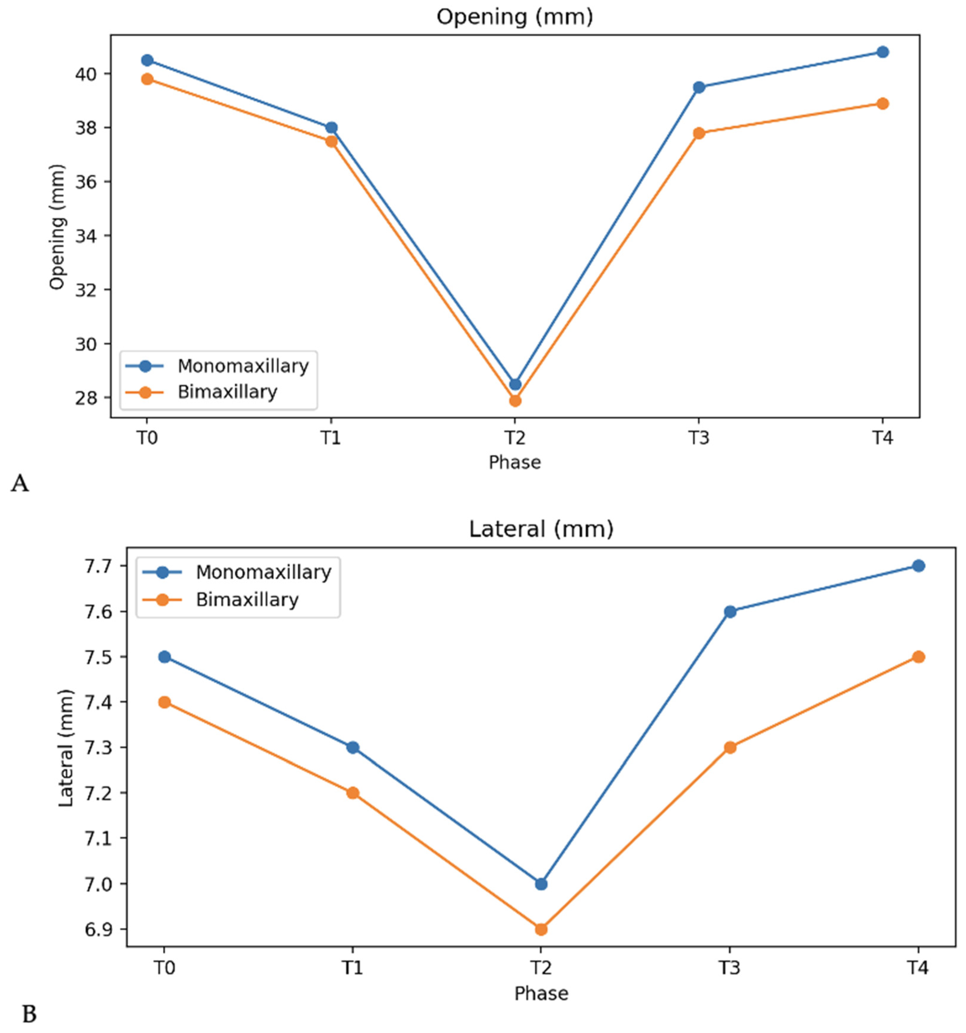 Figure 10). In the immediate postsurgical phase, mouth opening decreased in both groups, reaching values below 30 mm (28.5 ± 3.8 mm and 27.9 ± 4.0 mm, respectively). Subsequently, a progressive recovery was observed, with monomaxillary patients demonstrating a more stable improvement, returning to values close to baseline at the end of treatment (40.8 ± 4.0 mm), whereas bimaxillary patients showed slightly lower values (38.9 ± 4.3 mm). Lateral mandibular movements showed a similar pattern, with progressive improvement after surgery and no statistically significant differences between groups at final follow-up.