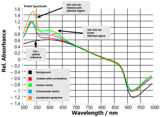 29]. We hypothesised that VIS–NIR HSI of FFPE skin sections could detect reflectance-based spectral markers associated with the mite exoskeleton and related structures and that these markers might persist even after routine haematoxylin and eosin (HE) staining. The present study, therefore, investigates whether VIS–NIR HSI can identify