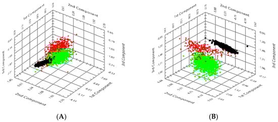 In unstained CaF2-mounted sections, three distinct clusters were observed in principal-component (PC) space. Background pixels formed a compact, narrowly distributed group, confirming calibration stability and the substrate’s spectral neutrality. Human tissue pixels occupied a broader region due to heterogeneity in scattering and absorption, whereas parasite-derived pixels clustered separately along the first two principal components. The first component (PC1) explained approximately 66% of the total variance, primarily reflecting spectral trends in the 700–900 nm range, dominated by chitin scattering, while PC2 accounted for an additional 17%. This apparent displacement of the parasite cluster confirmed that the characteristic NIR reflectance slope served as a dominant diagnostic feature. In HE-stained sections, overall clustering remained evident, although partial overlap occurred between host tissue and background because of the absorption of hematoxylin and eosin in the visible region.