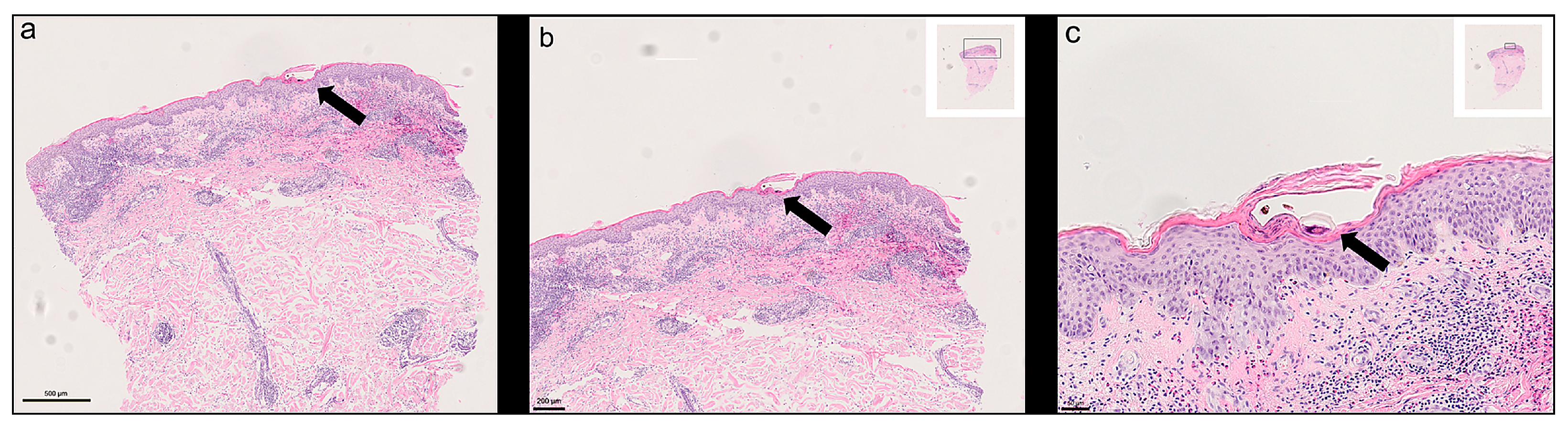 5]. Histological examination of punch biopsies can also reveal mites or mite fragments, but it is invasive and has modest sensitivity because the parasite is small, sparsely distributed, and easily missed in routine sections [