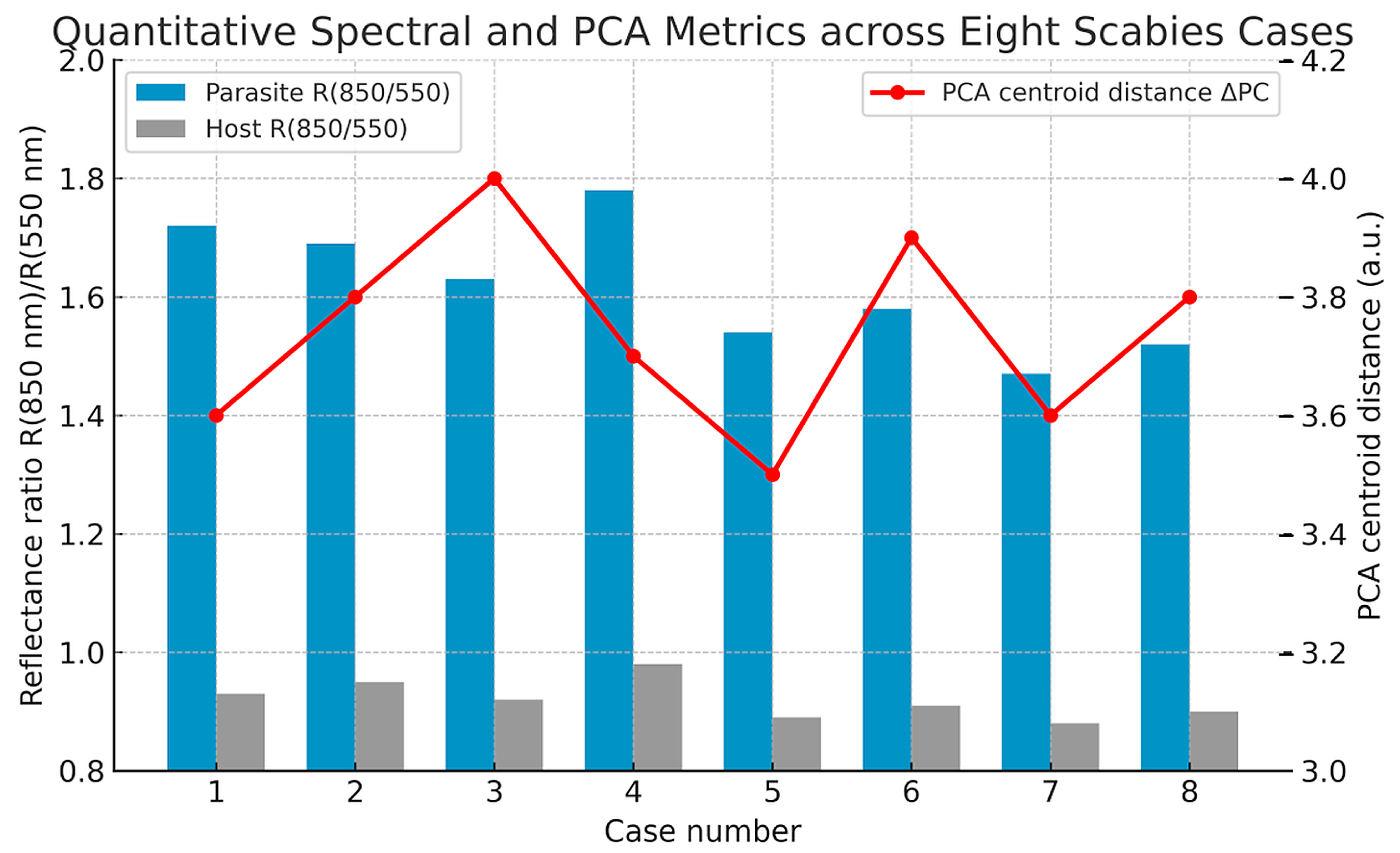 The consistent spectral separation across patients demonstrates the robustness of HIS for distinguishing the chitin-rich mite exoskeleton from host tissue, independent of sample origin or staining method. These quantitative and visual results together confirm that VIS–NIR HSI provides highly reproducible optical discrimination of S. scabiei. The stability of both spectral ratios and PCA metrics across multiple independent cases supports their potential use as candidate standardised parameters for quantitative characterisation and as inputs to supervised classification models in future studies that include negative and look-alike conditions. Together, these results demonstrate that VIS–NIR HSI provides a robust, label-free, and diagnostically compatible method for identifying mite-associated structures in routine histopathologic specimens, establishing a solid foundation for future development and controlled validation of automated digital approaches.
